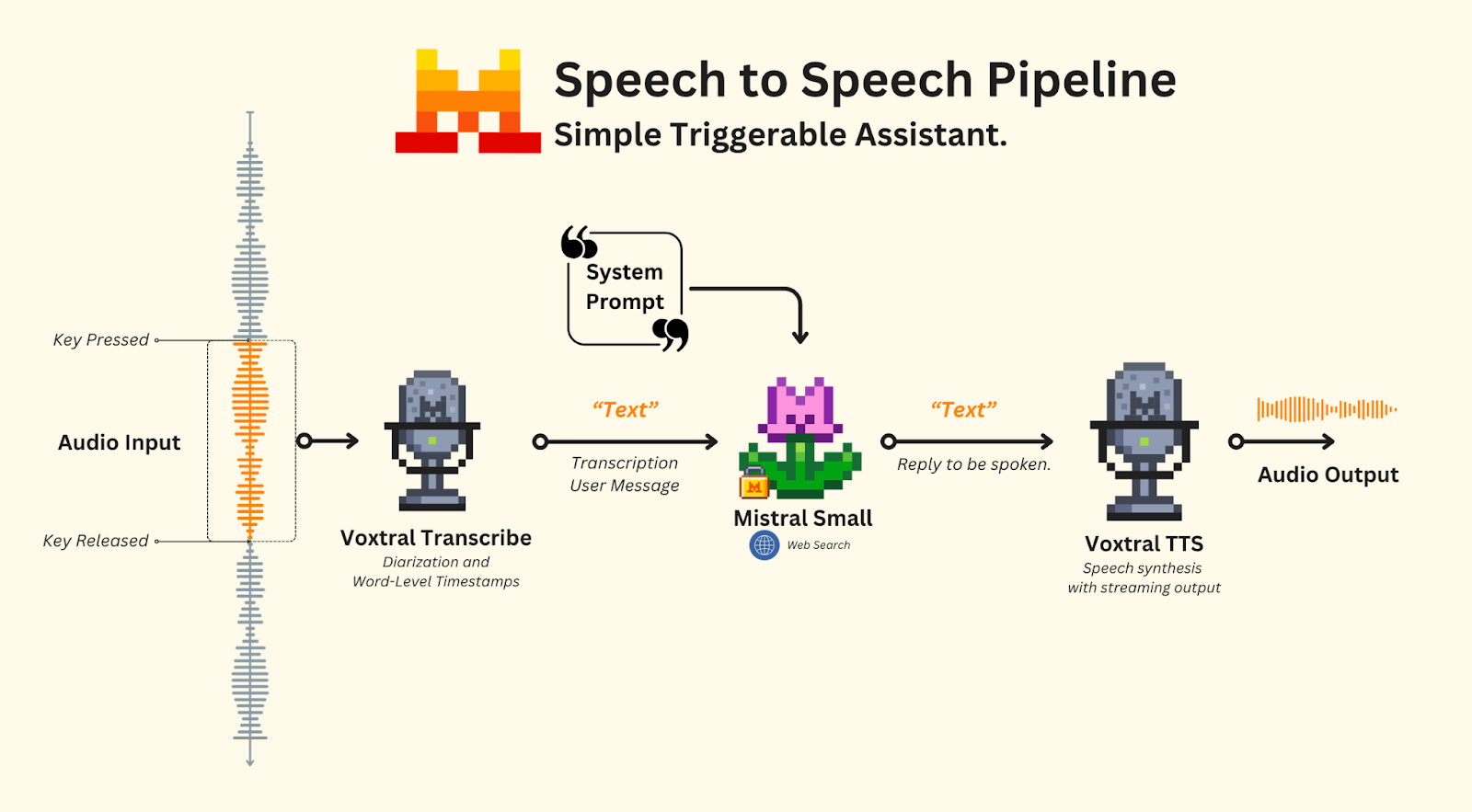 Once the transcription is received, we will send it as a user message to our assistant powered by Mistral Small. For this, we need to provide a system prompt with instructions explaining its role, as well as the tools it has access to - in this case, web search.