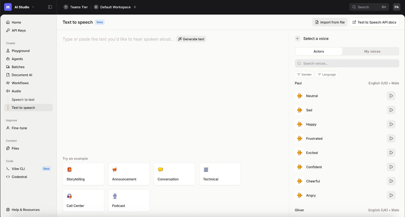 Last but not least, we will tackle the text-to-speech section. To use our TTS model via our AI Studio