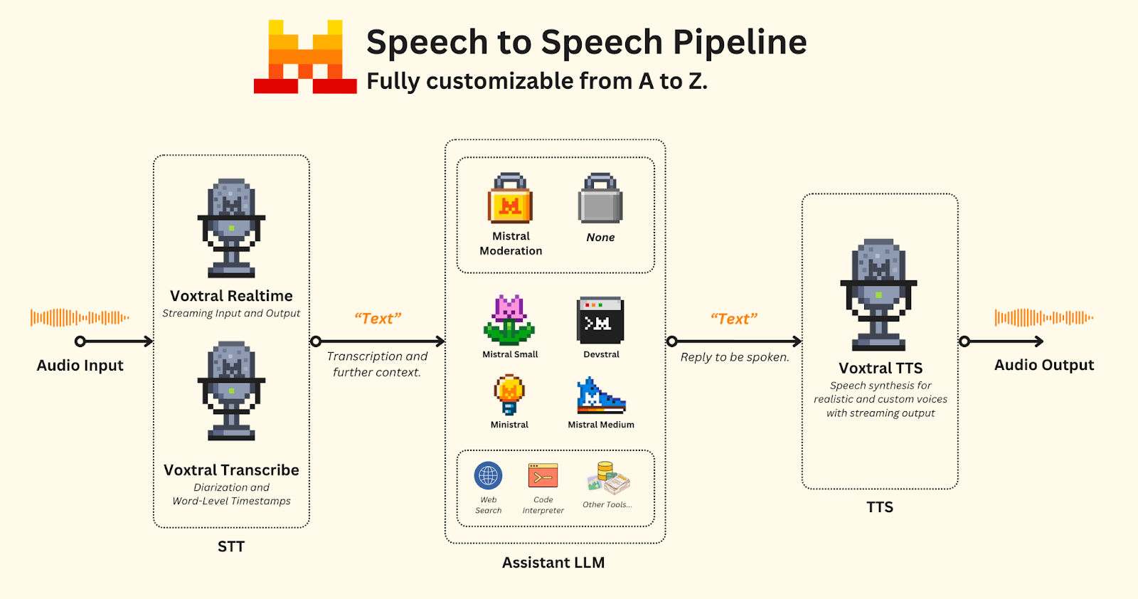 - Voxtral TTS, our first speech synthesis model with voice customization capabilities and output streaming. We also released a safe variant with fixed voices under CC BY-NC 4.0 license, which the model inherits.